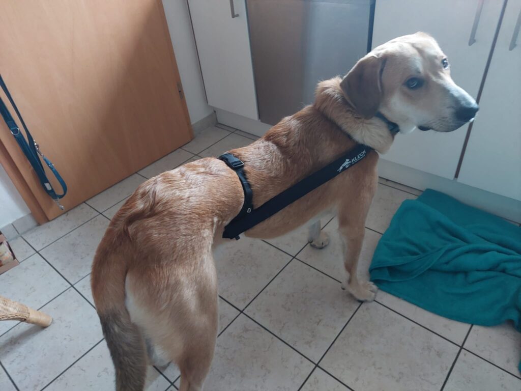 Euer Kleck ist unsere Rettung… ausgepackt, er war sogar schon passend für unsere BorderMix Hündin eingestellt, und ja, sie war ein klein wenig irritiert, aber hat sofort eingesehen, dass kein Schlecken an Bauch und auch hinteren Pfoten mehr möglich ist. Jetzt heilt alles super ab und wir können endlich ergründen, warum sie immer wieder diese Schleckattacken startet.